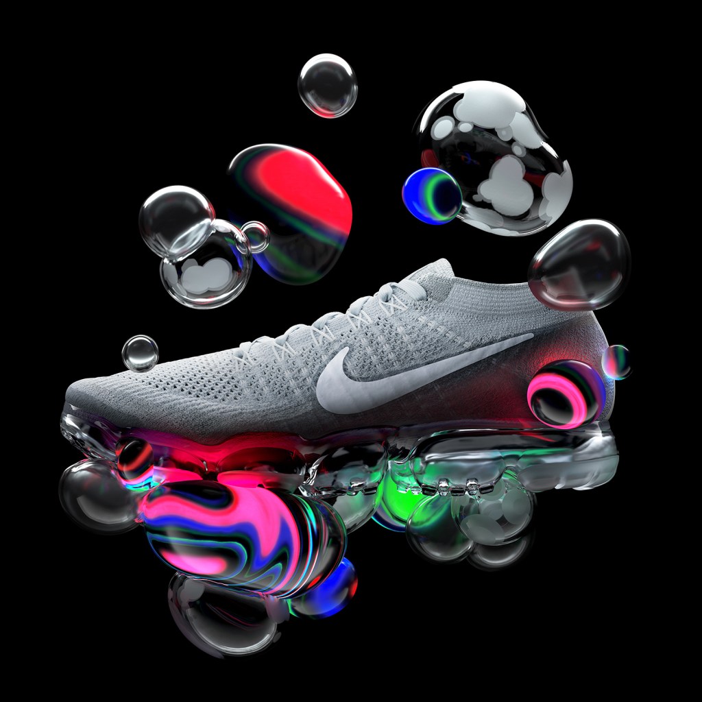 David McLeod is an Australian artist and designer. And on this particular piece with Nike he created a product visual and animation for the release of their VaporMax sneakers. The animation was projection even mapped onto the Centre Pompidou in France as a part of the official launch event held on Air Max Day. Overall his piece is very vibrant and shows off the grey sneaker very well. And in my opinion his color palette has been very well chosen because it doesn’t wash the sneaker out but it makes it clearly stand out with a very creative twist including the bubble like animation. Not only that but I especially like how the bubble like animation reflects its vibrant colors onto the sneaker. It adds to the piece very well.